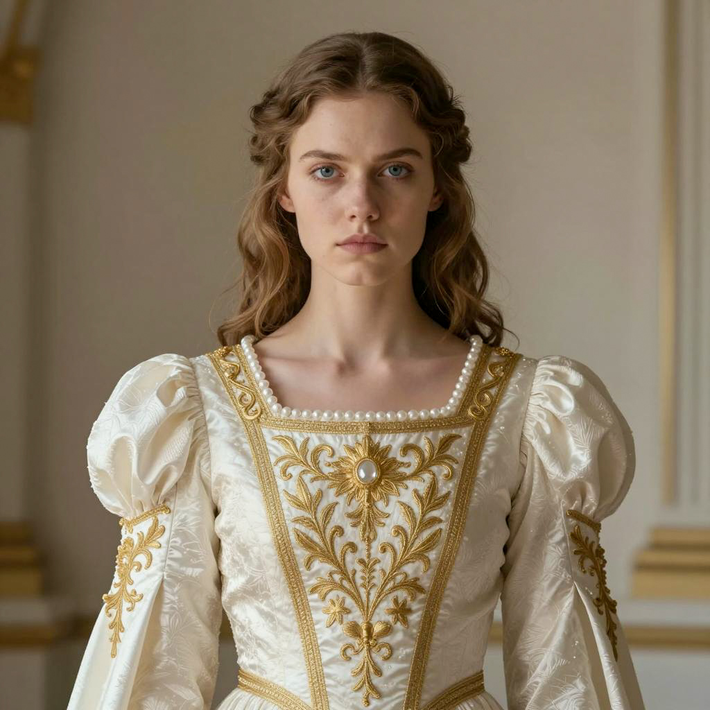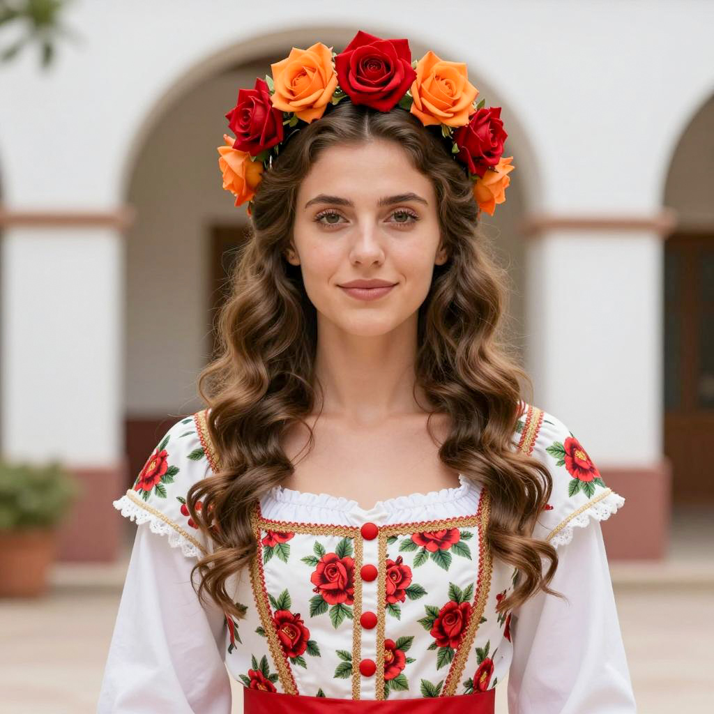 Delirium sandman costume, photorealistic portrait of young woman with blue eyes, wearing elaborate ancient crown with red roses, golden and beige braided headpiece, white scarf wrapped around head, beige robe, standing in stone colonnade, soft natural light, serious expression, ethereal, fantasy, detailed ures, realistic lighting, slightly blurry background, historical fantasy, elegant, serene atmosphere