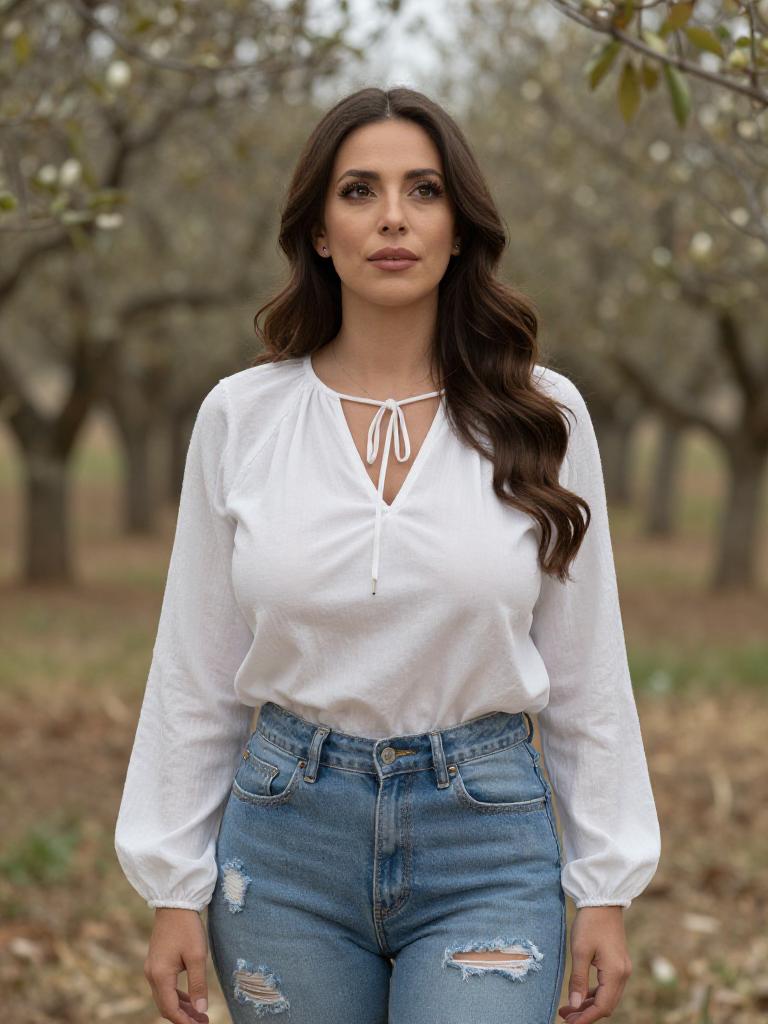 Photograph of a dark-haired woman with wavy hair, wearing a white long-sleeve blouse and ripped blue jeans, standing in an orchard