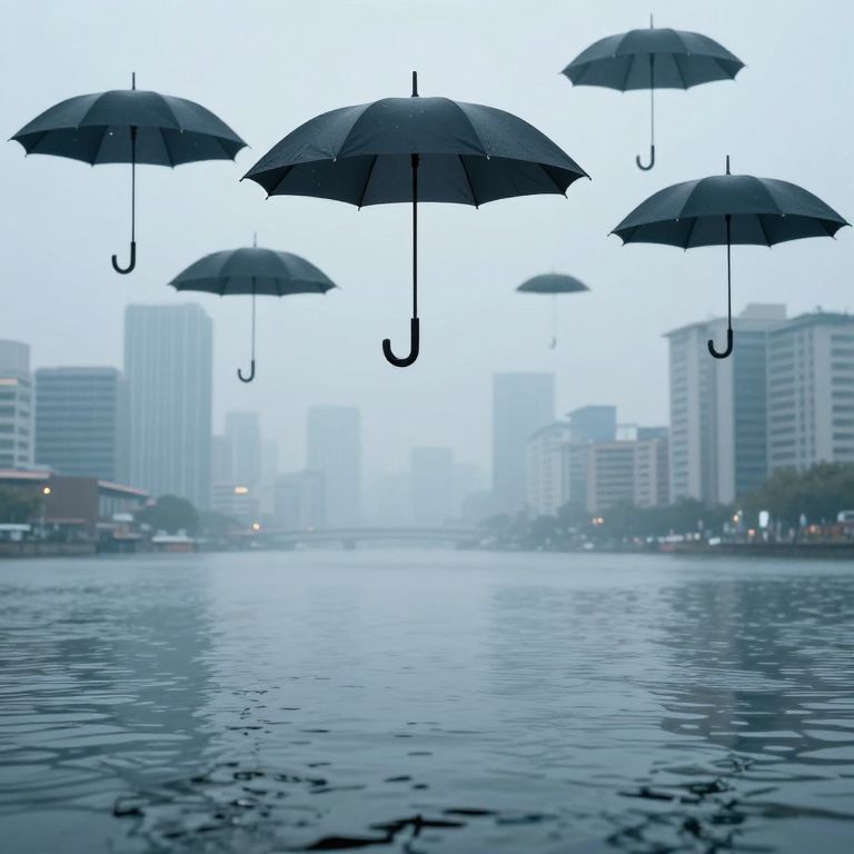 In a surreal cityscape where umbrellas float serenely above, the inversion of gravity and the gentle murmur of rising water evoke a dreamlike state of transcendence, blending the ethereal with the mundane in a poignant dance of hope and wonder.