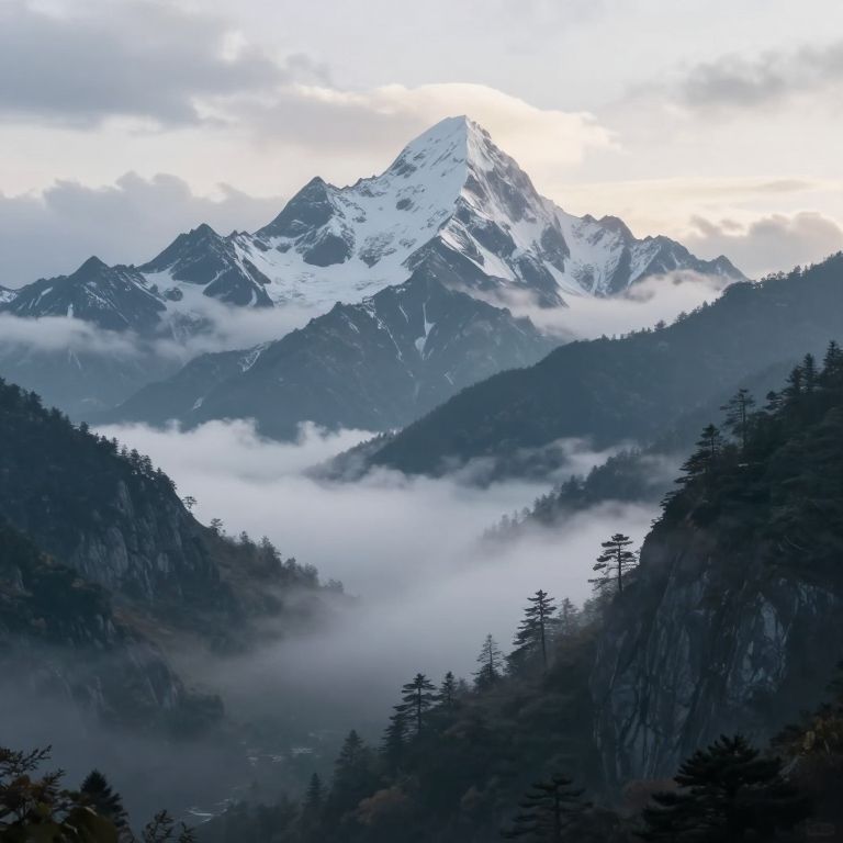 Serenity whispers through the misty valleys, where ancient peaks stand as silent sentinels of eternity, their snow-capped summits cradled by clouds that dance like memories of forgotten dreams.