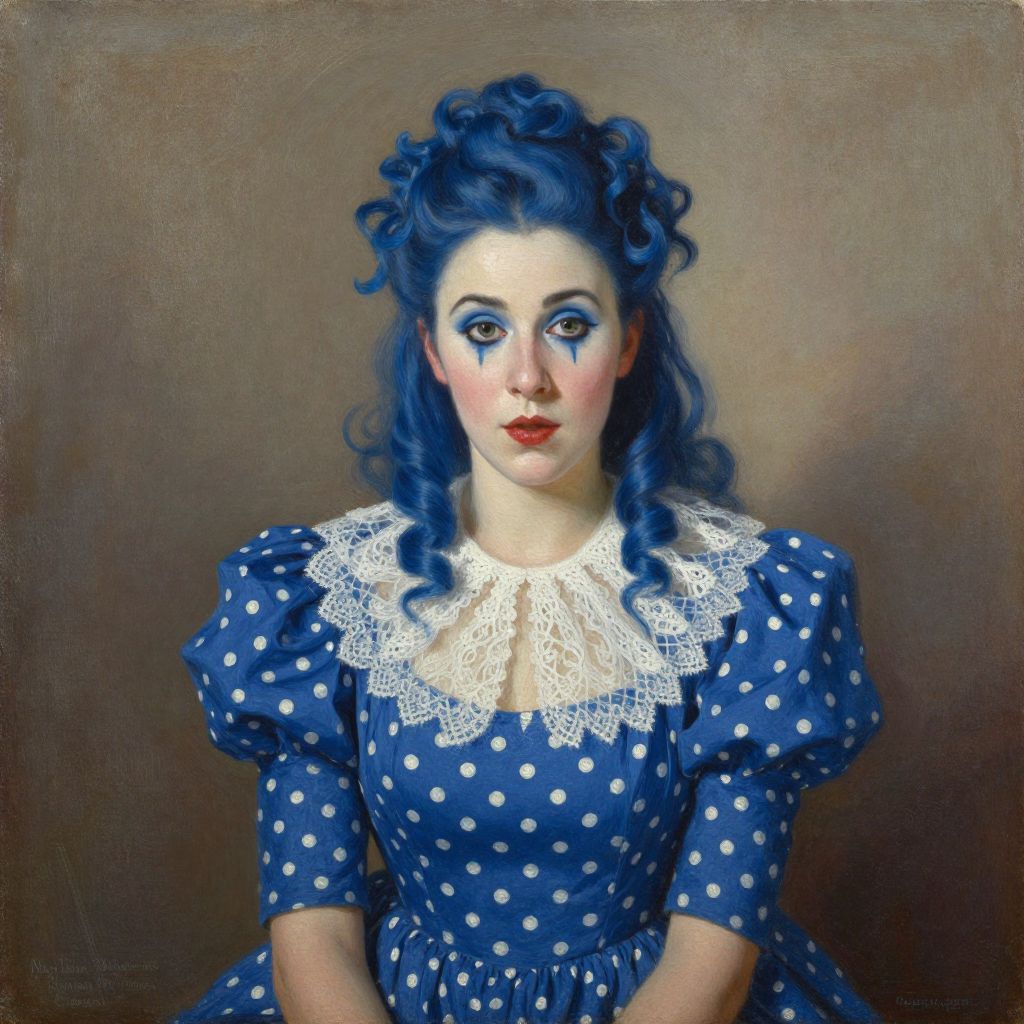 Vividly painted portrait of a pale-skinned woman with blue wavy hair, wearing a blue polka dot dress with a white lace collar,