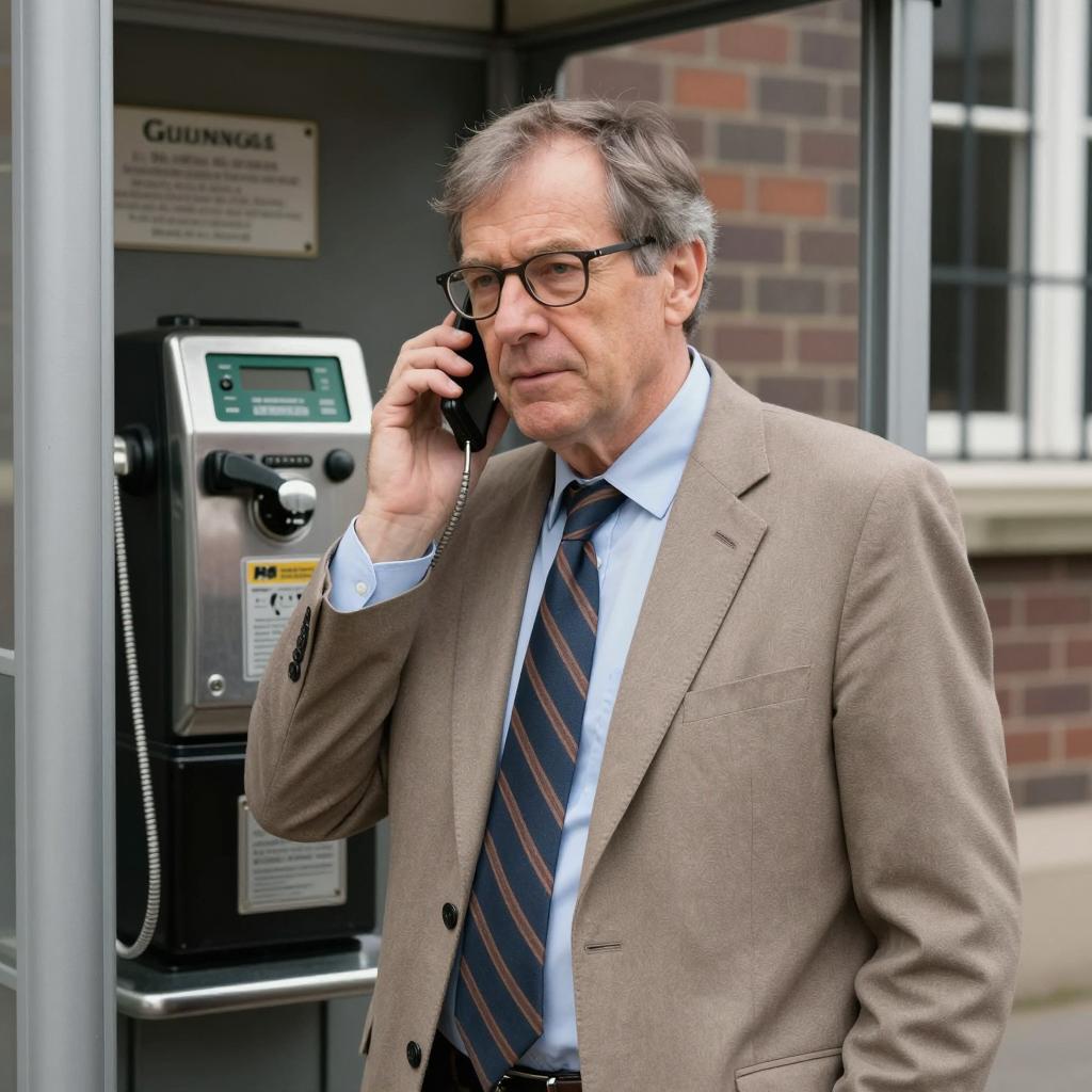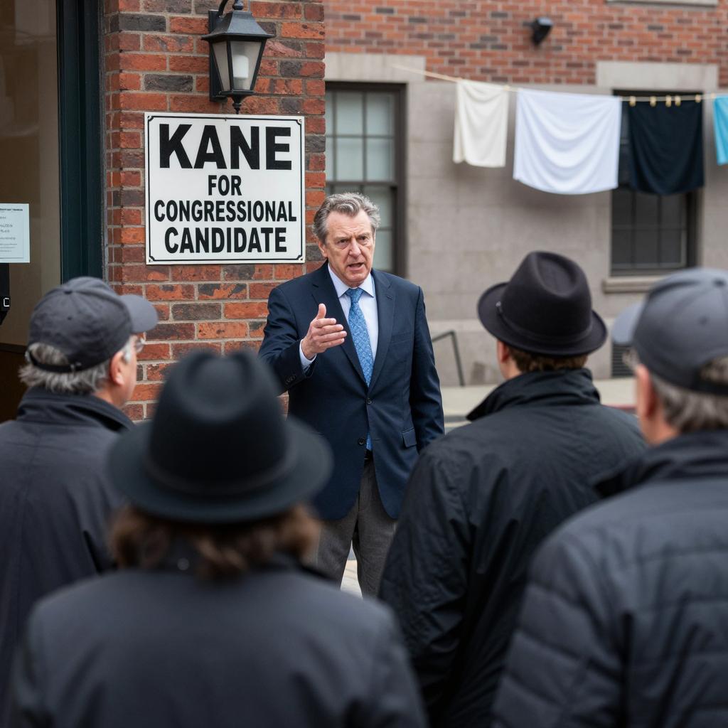 Middle-aged man in a navy suit and blue tie speaking passionately to a group of people wearing dark coats and hats. The man gestures with his right hand. Behind him, a sign on a brick wall reads 'KANE FOR CONGRESSIONAL CANDIDATE'. Urban street setting with a lantern, window, and laundry hanging in the background. Five people visible from the back, listening attentively.