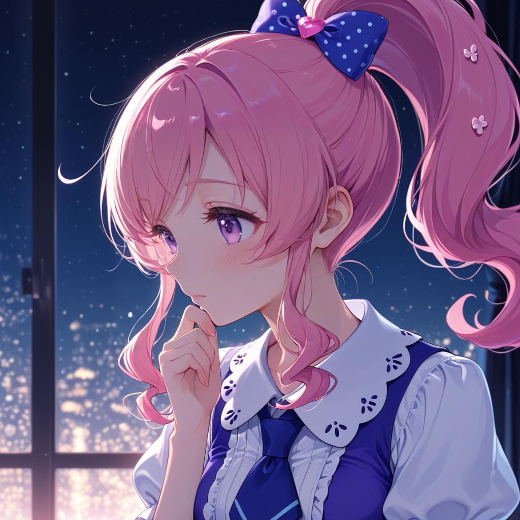 Momoyama mirai, pretty series, 1girl, blue eyes, purple eyes, pink hair, long hair, sidelocks, ponytail, high ponytail, hair bow, by artist citron 82, dark_illustrious