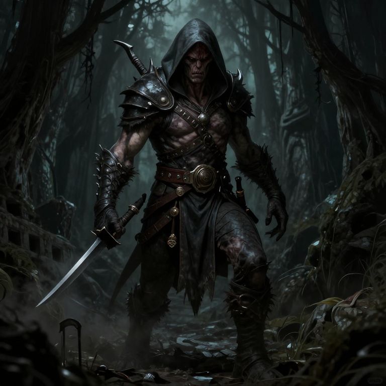 Repetition a full-frame d&d style illustration of a disfigured half-orc/half-elf rogue creature lurking in the shadows,