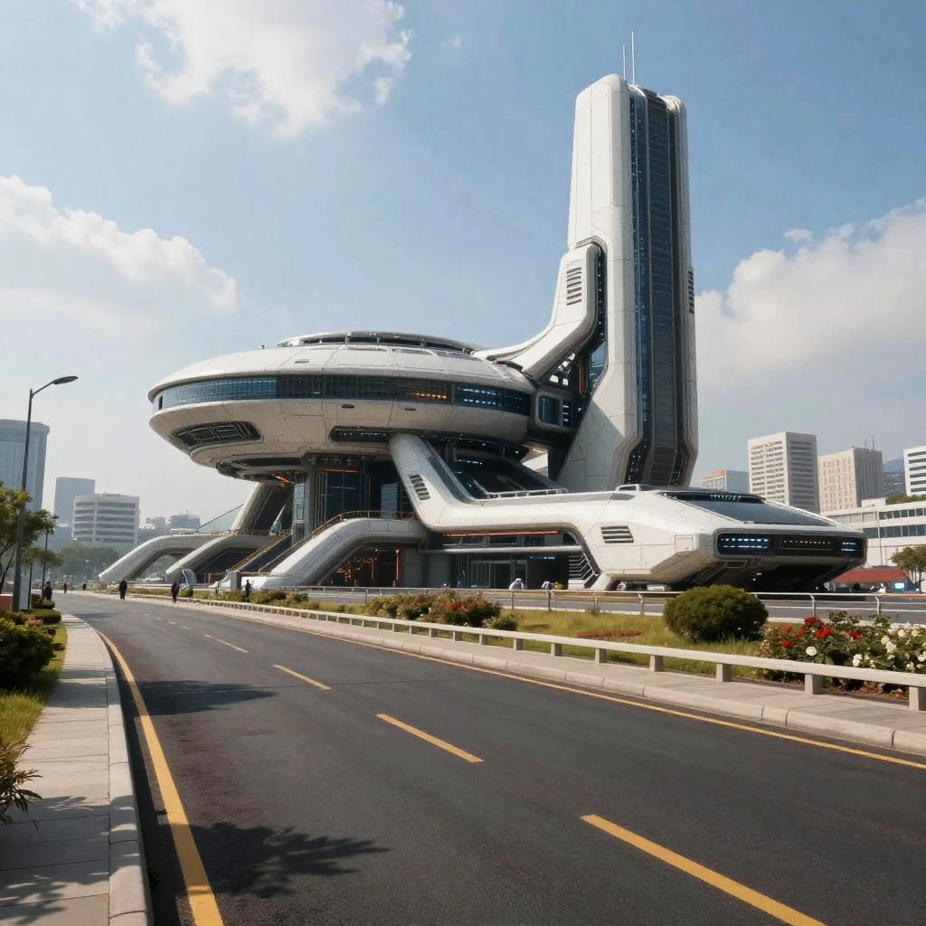 (masterpiece), (high quality), best quality, real, (realistic), super detailed, (full detail), (4k), 8k, outside, no humans, road, outdoors, building, science fiction, realistic, scenery, city, sky
