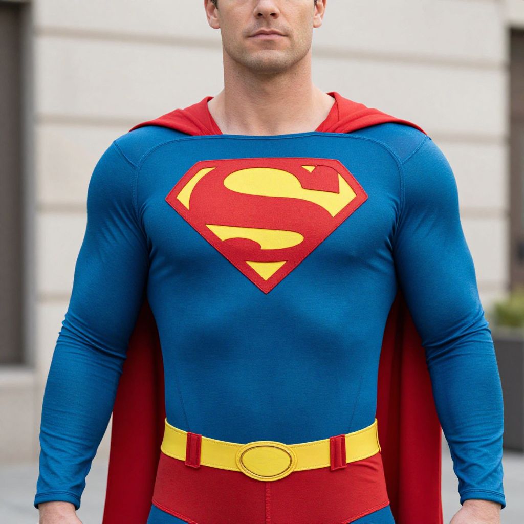 Superman Superman Dress Costume, a close up of a man in a superman costume standing in front of a building