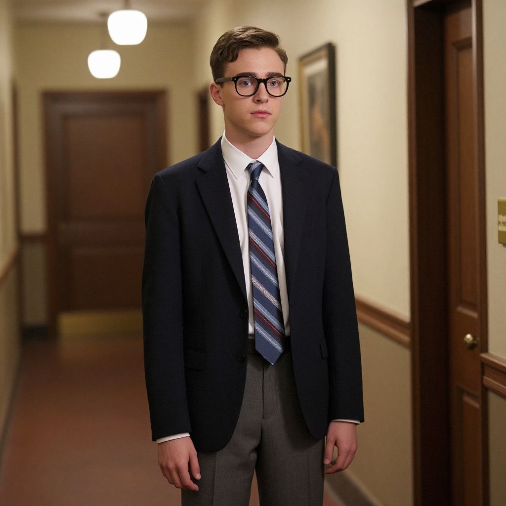 Photograph of a young white man with short brown hair and glasses, standing in a dimly lit hallway. He wears a dark navy blazer, white dress shirt, and a blue and red striped tie, paired with gray trousers. The hallway has cream-colored walls, dark wooden doors on either side, and red carpet. Two white ceiling lights are visible in the background. His expression is neutral, and he stands centered in the frame, looking slightly to the left. The overall atmosphere is formal and slightly nostalgic, reminiscent of a school or office setting.