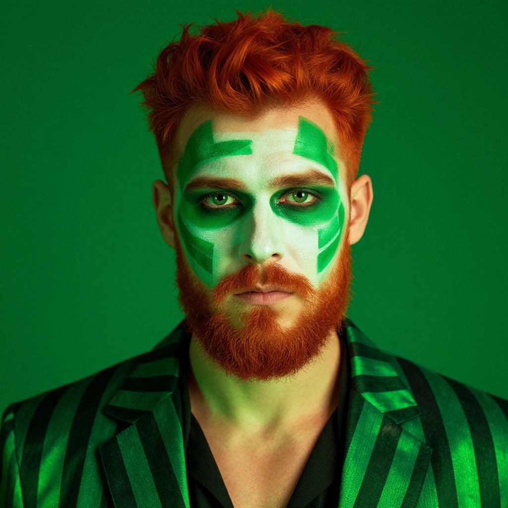 Photograph of a Caucasian man with bright red, tousled hair and a full beard, set against a solid green background. His face is painted in green and white geometric patterns, resembling a mask, with green accents on his forehead, cheeks, and around his eyes, contrasting with white on his nose and chin. He wears a black, vertically-striped shirt with a slightly open collar. His green eyes are staring directly at the camera, creating an intense, almost haunting expression. The lighting highlights the vivid colors and textures of his face paint and hair, adding depth and contrast.