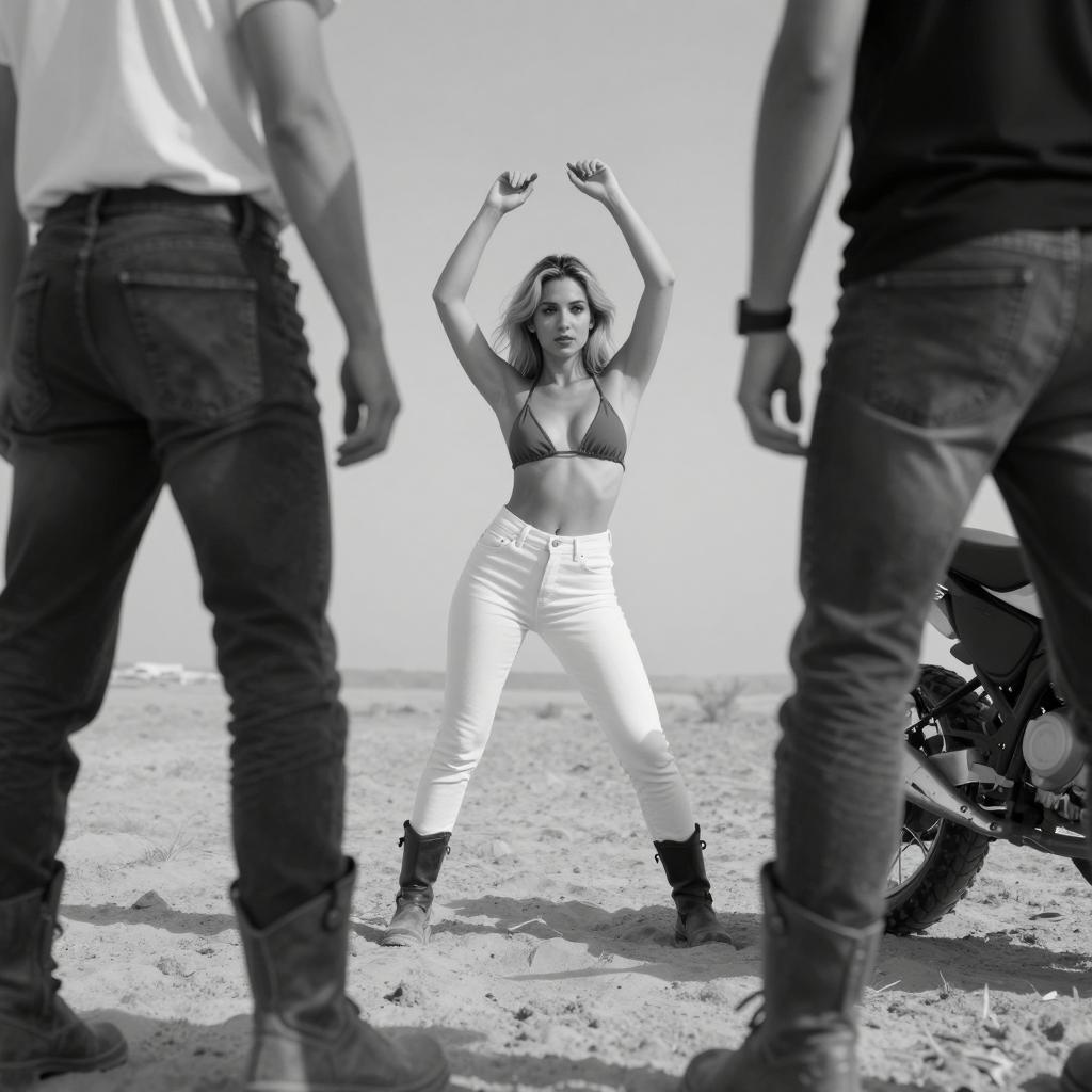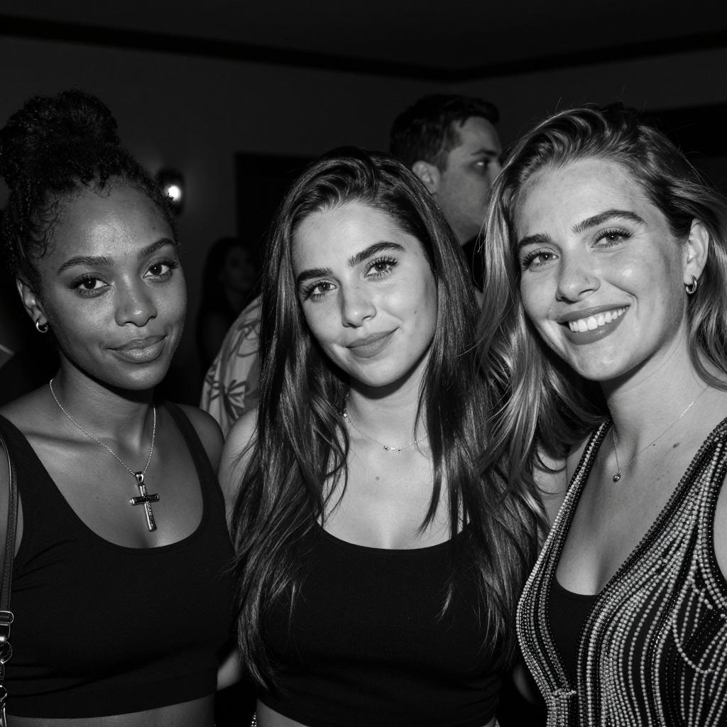Black and white photograph of three women standing next to a classic car. Left woman with dark hair, white sleeveless top, black pants, black boots. Center woman with blonde hair, white crop top, white shorts, white boots, smiling. Right woman with dark hair, black top, black pants, black boots, hand on hip, smiling. Classic car on left. Clear sky background. All three women standing upright, facing camera, smiling.