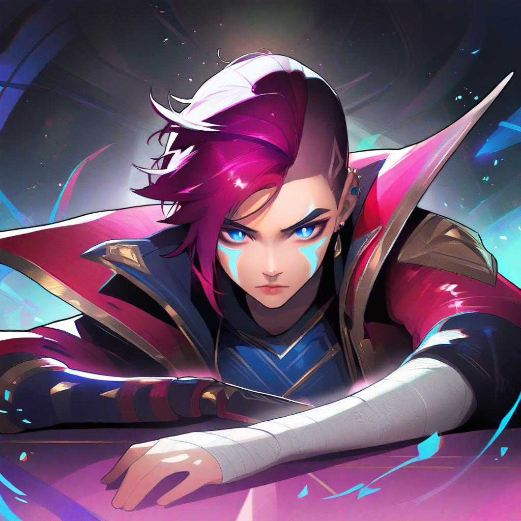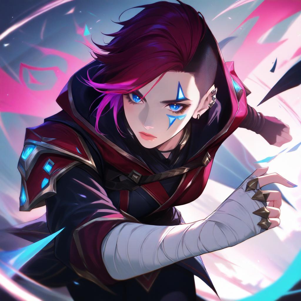 Arcane vi, league of legends, 1girl, ear piercing, blue eyes, short hair, red hair, pink hair, facial tattoo, neck tattoo, red jacket, nose piercing, sidecut, bandaged arm, by artist ro g (oowack), animagine