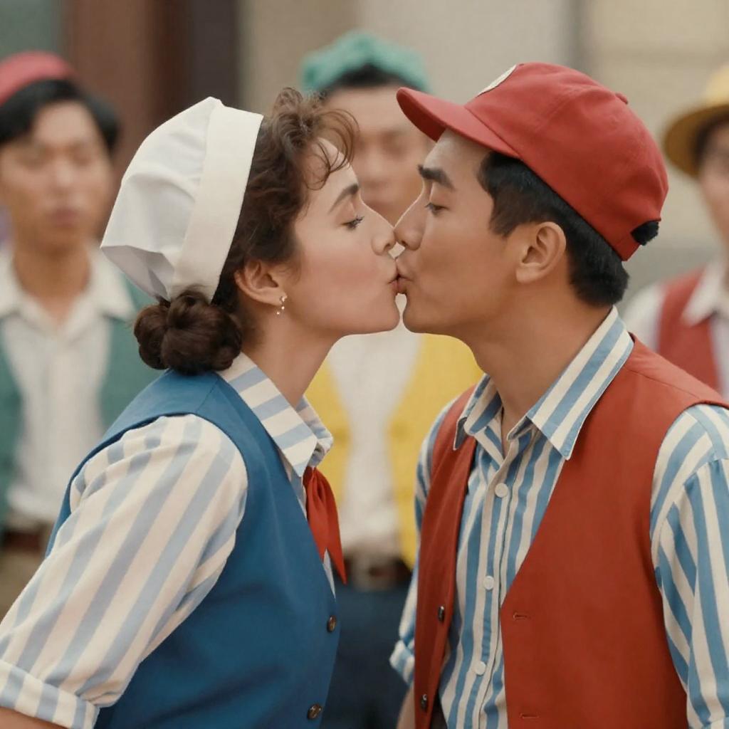 Vintage movie poster. Three people in striped shirts, colorful vests, and head coverings. Woman kissing man in striped shirt, man with red cap looking at her. Background shows indistinct crowd. Bright colors, comedic expressions. Horizontal composition.