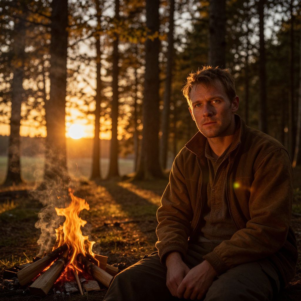 Photograph of a young man with short blonde hair, wearing a brown jacket, sitting by a campfire in a forest at sunset, with warm orange