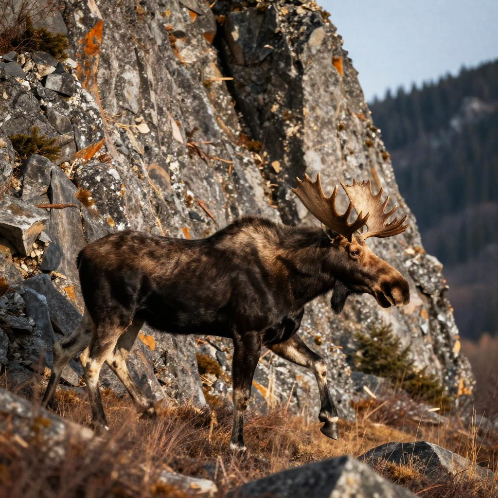 Epic scene of a Canadian riding moose galloping across mountainous terrain, rugged rocky cliffs, dynamic motion blur, crisp early morning light, intricate fur shadows