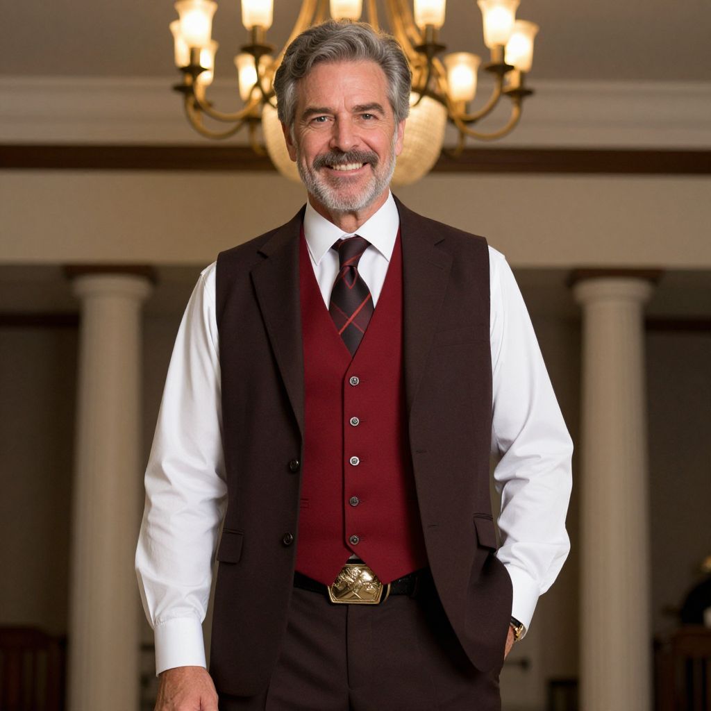 Photograph of a middle-aged man with grey hair and a salt-and-pepper beard, smiling warmly. He is wearing a white dress shirt, maroon waistcoat, and black vest with a black and red striped tie. His black pants have a decorative gold belt buckle. The background features a softly lit, elegant room with a chandelier and white columns. The man's confident and approachable demeanor is highlighted by the warm, inviting light. The overall style is formal and sophisticated.