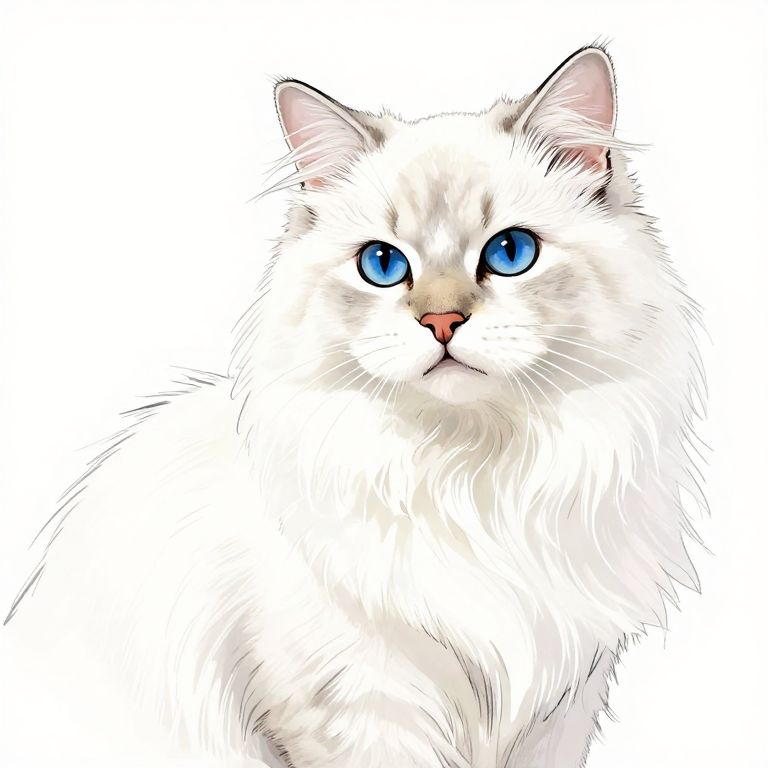 A digital illustration of a fluffy white cat with strikingly large, bright blue eyes and a small pink nose. The cat's fur is meticulously detailed with soft, white strokes, giving it a realistic yet slightly stylized appearance. Its ears are pointed and slightly tilted, and it gazes directly forward with a calm, somewhat indifferent expression. The background is completely white, making the cat the sole focus of the image. The overall style is clean and modern, with a strong emphasis on the cat's vivid eyes and fluffy fur texture.