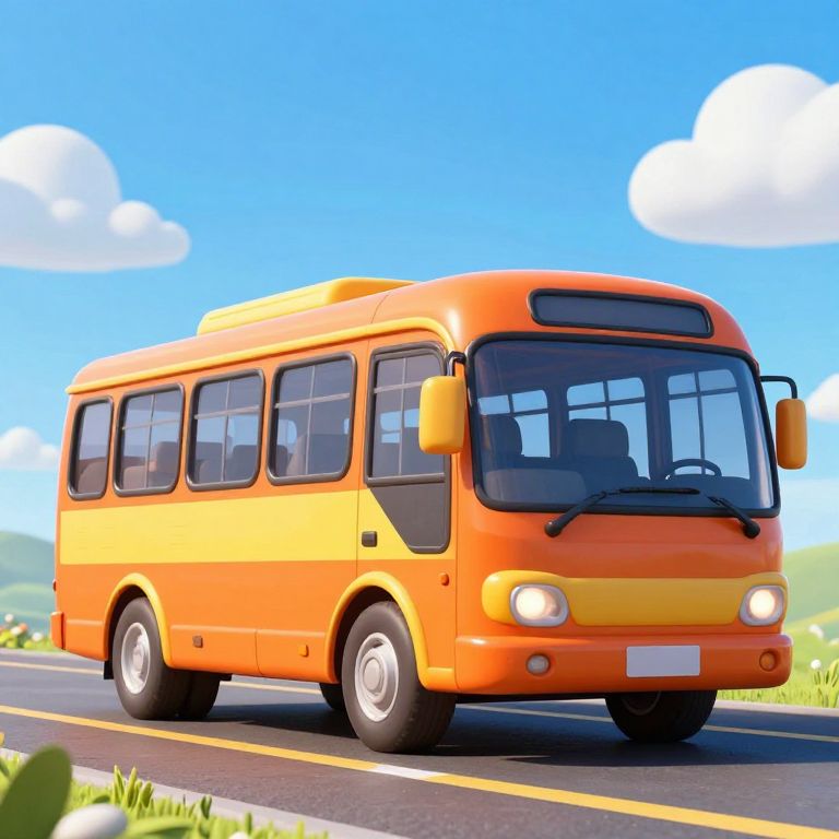 A vibrant cartoon-style illustration of a bright orange bus with yellow accents, set against a clear blue sky with fluffy white clouds, showcasing a high-definition, computer-generated visual effect that captures the essence of a scenic road trip in a lively and engaging manner.
