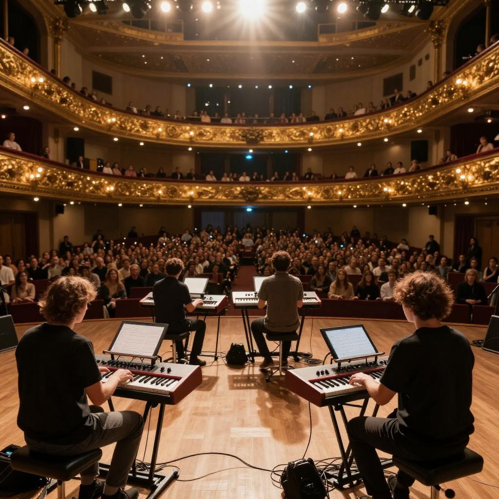 A cinematic view from behind a group of musicians performing at a packed concert in a large, multi-tiered theater. Dramatic golden stage lighting highlights the main band at center stage, with a focus on keyboard players in the foreground. The grand audience is captivated by the live performance under warm spotlights and subtle blue accents.