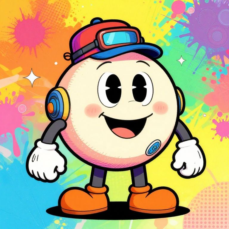 Cartoon character mashup generator visual style, experimental blend of vintage and modern cartoon traits in one hybrid character, quirky and humorous with imaginative accessories, colorful background with splashes and patterns, hand-drawn digital art