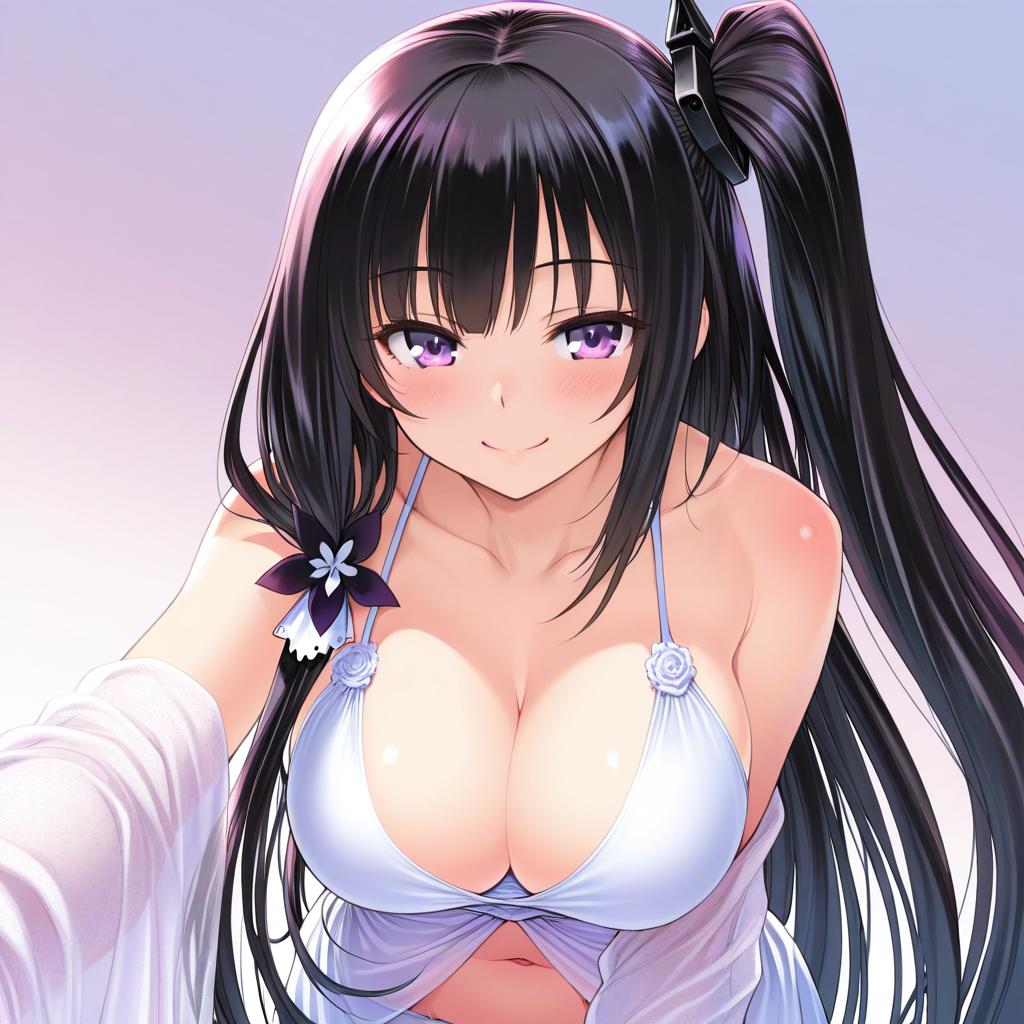 Architect (girls' frontline), girls' frontline, 1girl, pink eyes, purple eyes, black hair, very long hair, side ponytail, hair ornament, medium breasts, large breasts, cleavage, navel, collarbone, bare shoulders, pink nails, nail polish, one side up, by artist iroyopon, leet