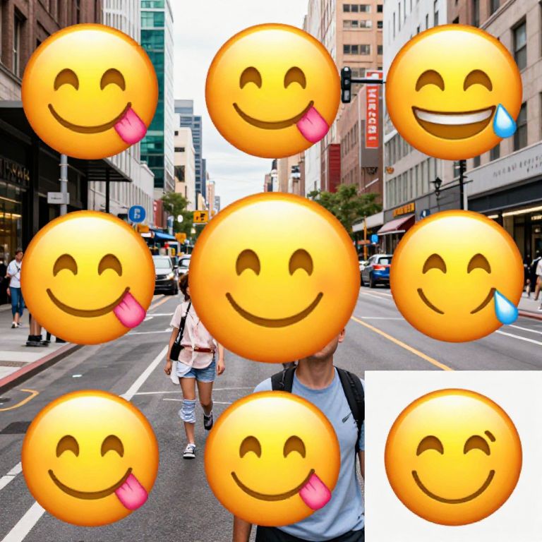 Photograph of urban street with people, overlaid with nine yellow smiley faces with varied expressions and tongue-out emojis.