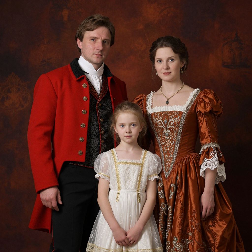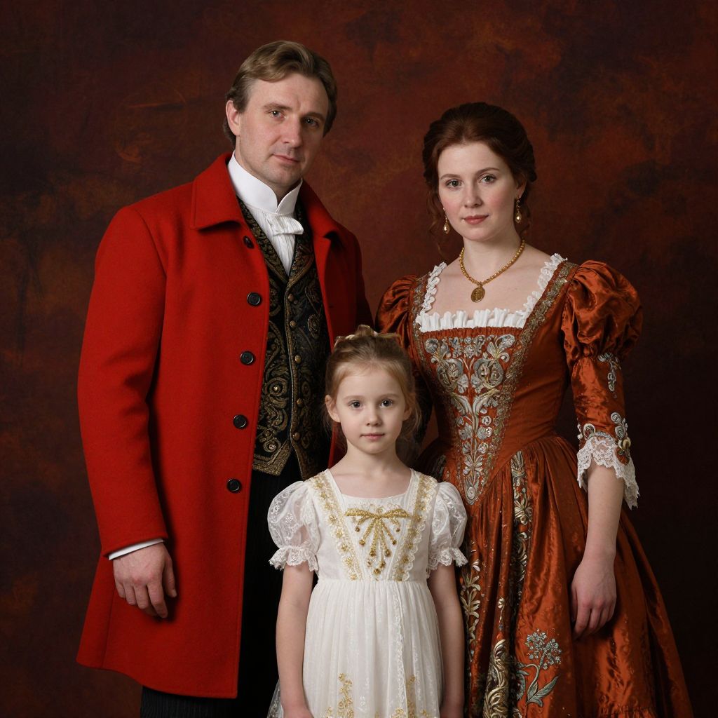 A classic Russian-style family portrait rendered in a high-definition digital art medium, featuring a man in a vibrant red coat and vest, a woman in an elegant rust-colored gown adorned with intricate lace details, and a child in a delicate white dress with gold accents, all set against a richly textured backdrop with dramatic lighting reminiscent of traditional 19th-century portraiture.