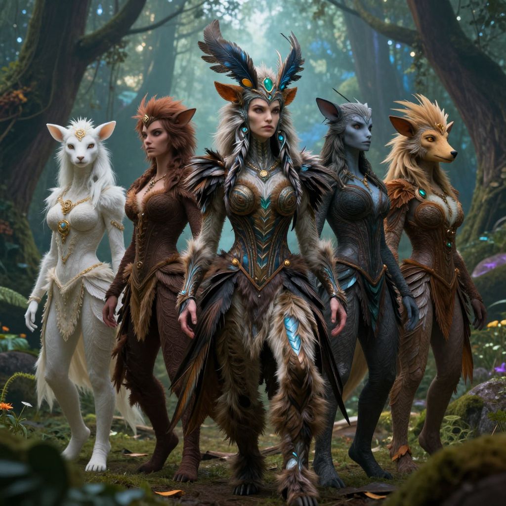 Half human, half animal creatures standing in a mystical forest, ethereal lighting, intricate fur and feather details, expressive faces blending human and animal traits, fantasy art style, vibrant colors, dynamic poses, cinematic atmosphere.
