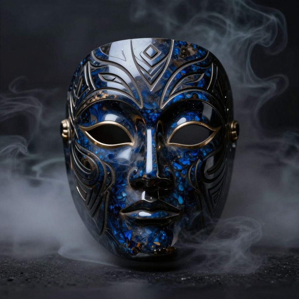 Photograph of an intricately designed, blue, marble-like masquerade mask with gold accents. The mask features symmetrical, abstract patterns and empty, almond-shaped eye holes. A subtle glow highlights its reflective surface. Wisps of smoke surround the mask, creating a mysterious, ethereal atmosphere against a dark, blurred background. The mask's texture is smooth with a glossy finish, and its artistic style suggests a mix of Baroque and modern influences. The overall composition evokes a sense of mystery and elegance.