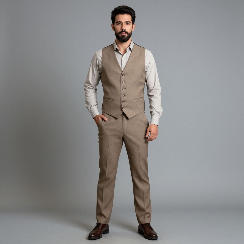 Photograph of a medium-built, bearded man with short, dark hair, standing against a plain, light gray background. He wears a beige three-piece suit with a white dress shirt, brown leather shoes, and no tie. His left hand is in his pocket while his right arm hangs by his side. The suit is well-fitted, with a single-breasted vest and matching trousers. The lighting is even, highlighting the smooth texture of the fabric and the polished finish of his shoes. The overall style is formal and professional.