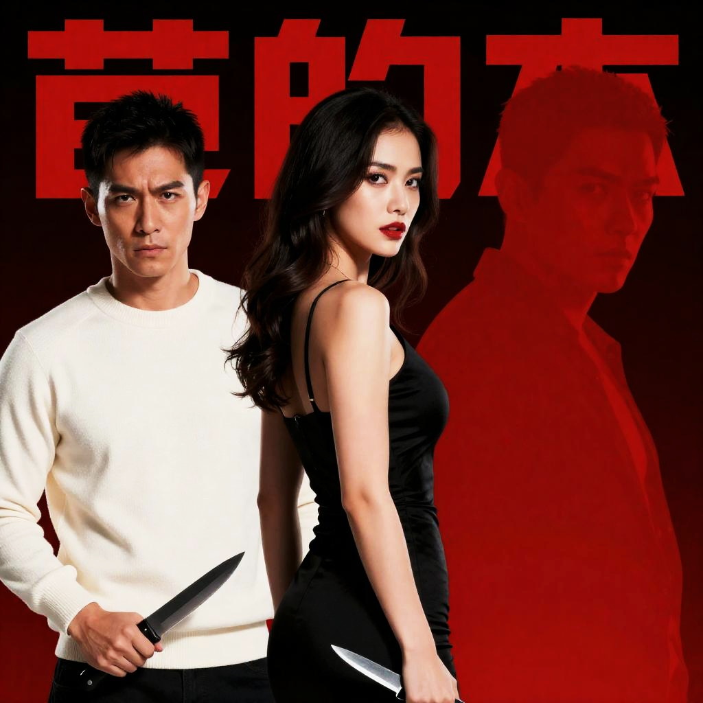 A movie poster featuring two Asian actors and a red silhouette on a dark background. The male figure on the left wears a white sweater and holds a knife with an intense expression. The female figure in the center is dressed in a sleek black dress, holding a knife, looking confident in profile. Bold red Chinese characters form the title in the background.
