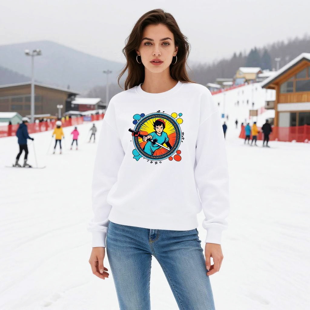 A woman, in a casual white graphic sweatshirt with a colorful print and light blue skinny jeans, standing in a snowy ski resort, styled like an image comic. Sexy. Pretty face and beutiful eyes