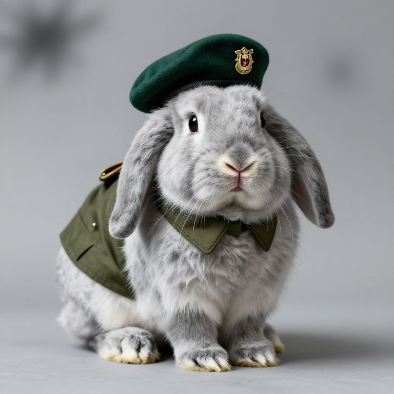 Ink Smudge A light grey seal point lop eared rabbit wearing a military uniform and green beret. The rabbit is sitting on a grey studio backdrop.,
