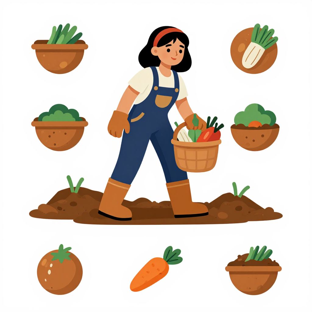 Cartoon illustration of a smiling woman in blue overalls, brown boots, and red headband, holding a basket of vegetables, standing on dirt with