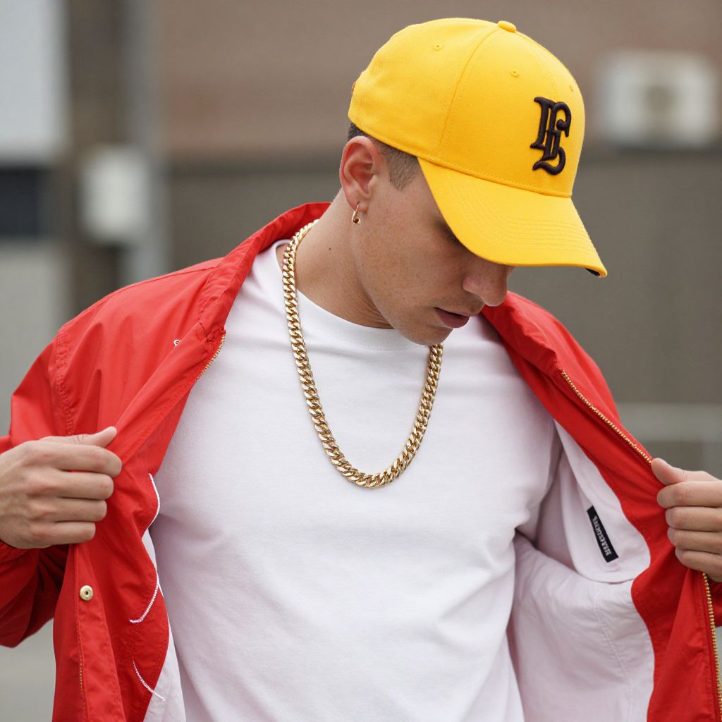 Hip hop clothing brands, 1boy, male focus, solo, jewelry, hat, necklace, jacket, baseball cap, shirt, white shirt, red jacket, yellow headwear, earrings, blurry background, open jacket, open clothes