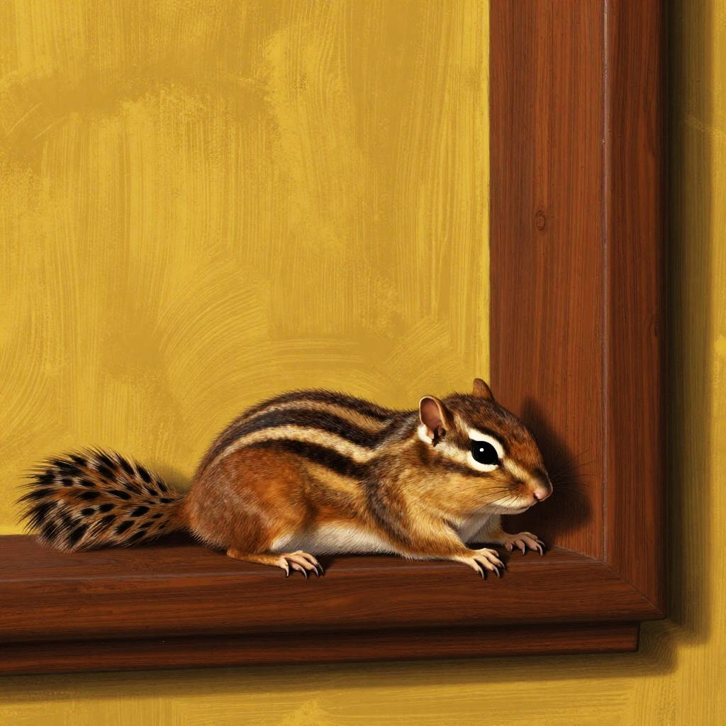 Illustration of a curious chipmunk, laying in the corner of a wall. Rendered in the style of golden yellow and rich mahogany, influenced by Konstantinos Parthenis and Louis Majorelle, featuring surreal yet realistic textures and emotional depth.