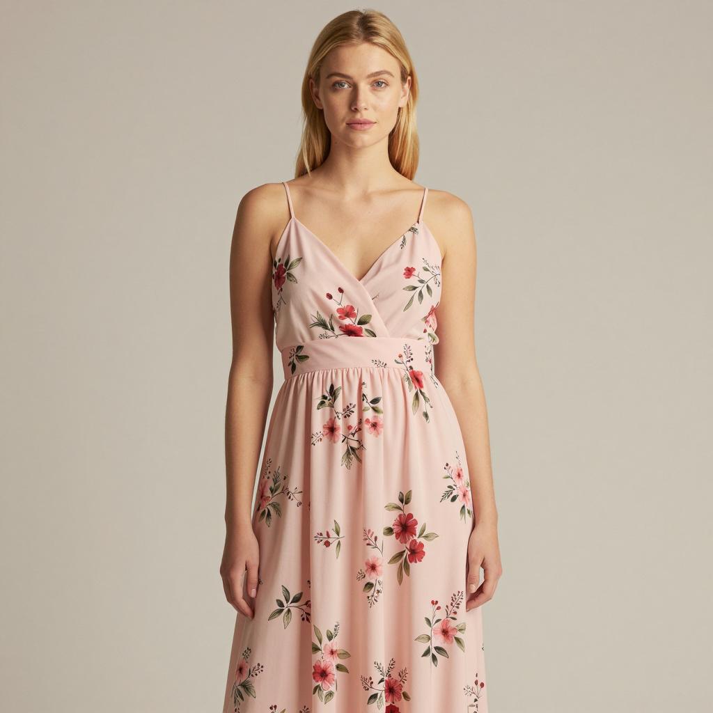 Beautiful floral dress, photorealistic, female model, standing in garden, daytime, wearing floral dress, red and pink flowers, white background, pink roses, summer, light brown wavy hair, white earrings, soft sunlight, relaxed expression, full body shot, casual, natural light, floral pattern dress, green leaves, soft focus, outdoor setting, realistic style