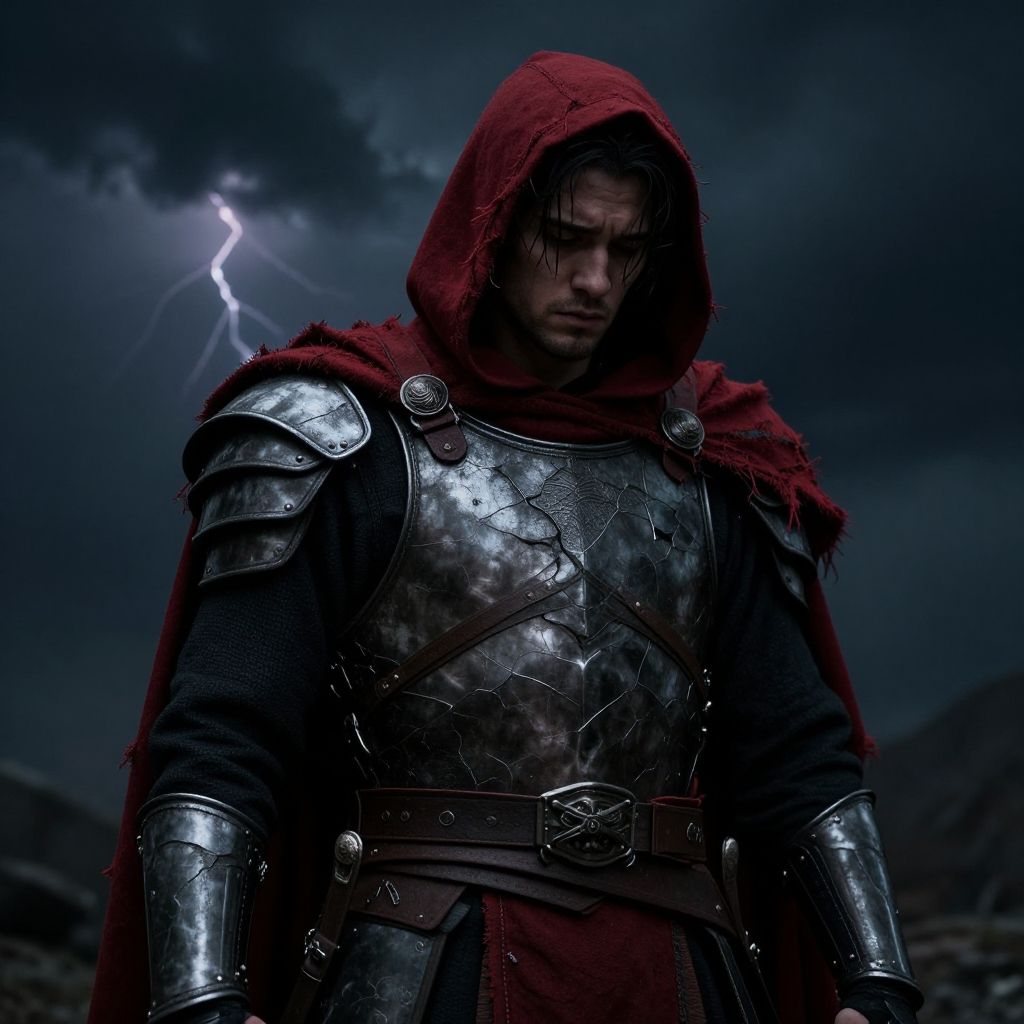 Dark, stormy night with a brooding warrior in shiny, medieval armor and red hood, lightning illuminating the ominous sky. Photorealistic CGI