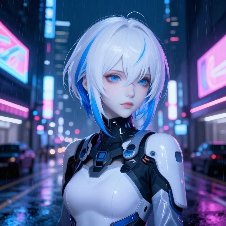 Digital anime-style artwork of a white-haired, blue-eyed cybernetic woman with glowing neon lights and rain in a futuristic city.