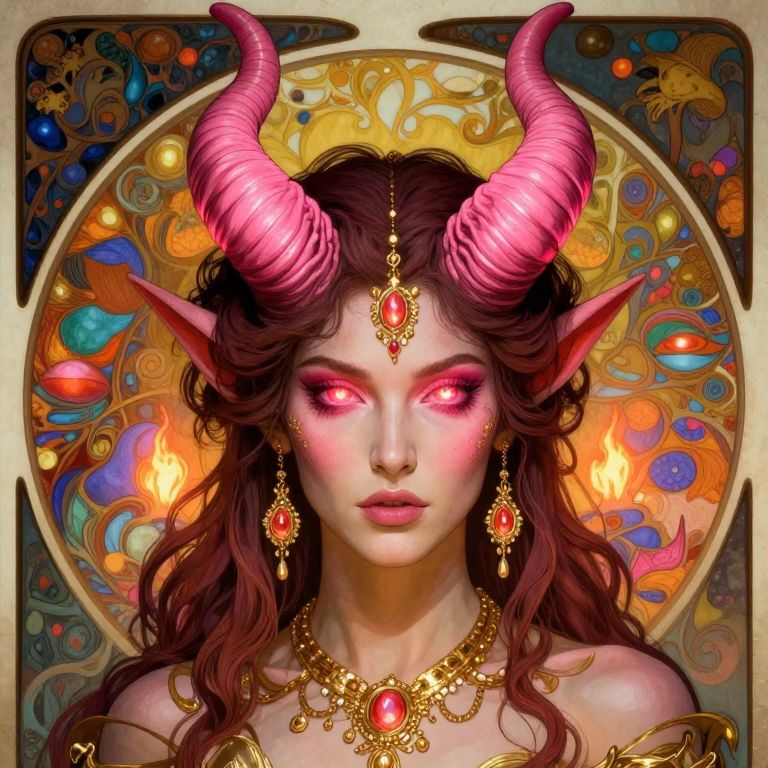 This is a digital artwork of a fair-skinned, red-haired woman with striking, curled locks. She has large, golden horns on her head, and her green eyes are accentuated with dramatic, dark makeup. Her full, red lips are slightly parted. She wears an off-the-shoulder, gold, ornate garment. The background features an intricate, circular, floral pattern with golden and pastel hues, framed by black and gold borders. The overall style is reminiscent of Art Nouveau with a fantasy twist, blending natural and mythical elements seamlessly.