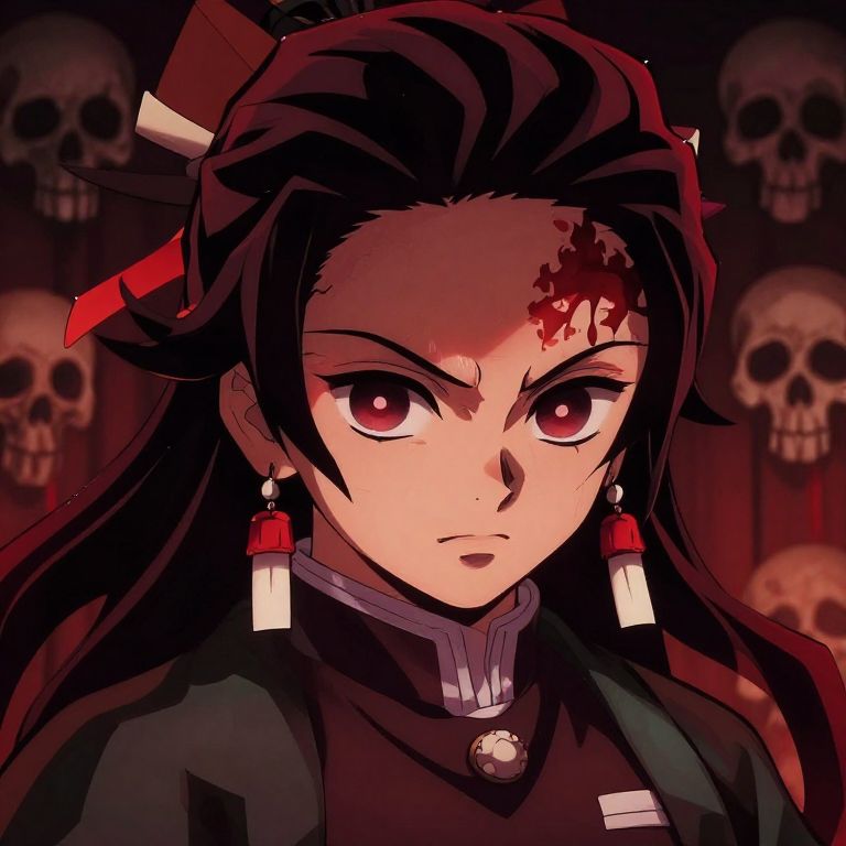 Daki Demon Slayer face with fierce expression, sharp contrasting colors of deep reds and blacks, ornate hair ornaments with flowing dark hair, detailed skin textures, glowing eyes with supernatural vibe, atmospheric background with subtle skull motifs, anime-inspired digital painting.