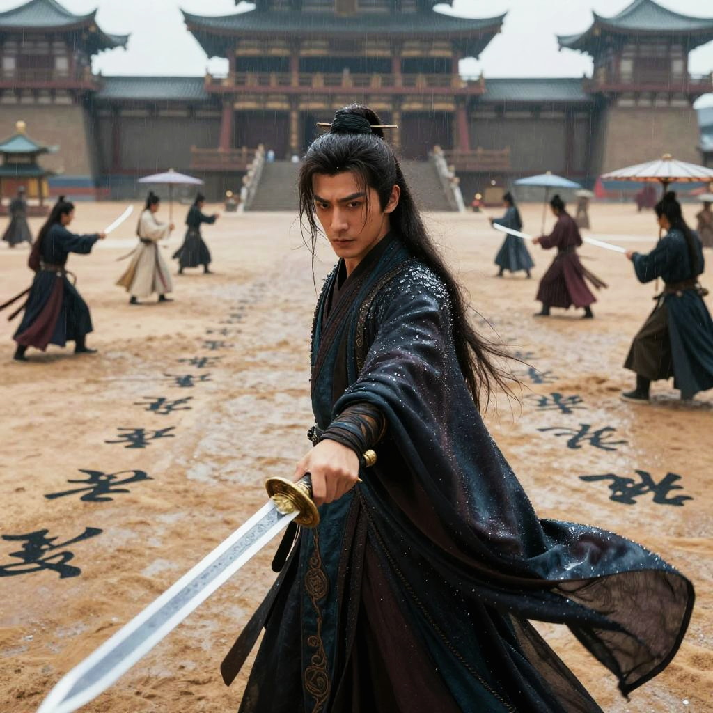 Digital illustration of five Asian men with long black hair, wearing traditional white and blue robes, in dynamic poses. Central figure raises hands, middle finger pointing upward, intense expression. Background shows detailed Asian village scene, autumn trees. Two men shout, one with arm raised. Smaller figures in foreground, diverse poses. Rich colors, detailed ures.