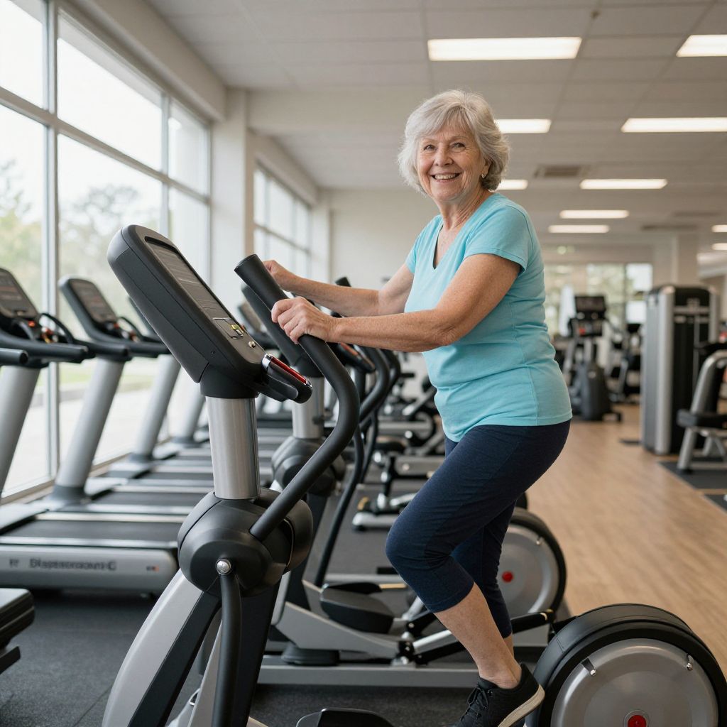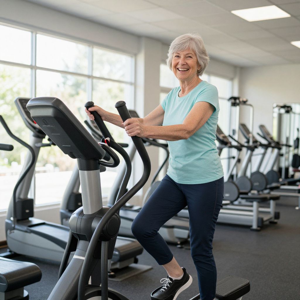 Senior woman smiling brightly while exercising on elliptical equipment in a well-lit gym, surrounded by various fitness machines and natural light streaming through large windows.