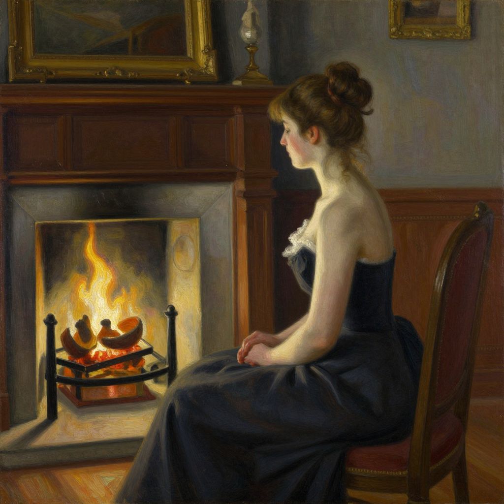 A painting of a woman in a black dress, seated on a wooden chair, gazing at a roaring fireplace in a dimly lit, elegant room
