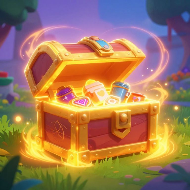 A vibrant, digital illustration of a glowing, magical treasure chest sitting on a grassy lawn. The chest is red with golden trim and a large, gold, heart-shaped lock. It is open, revealing a variety of glowing items including a purple potion bottle, a blue vial with a white cork, and a heart-shaped gem. Bright, orange energy swirls around the chest, illuminating the scene. The background features a blurred, colorful garden with trees and flowers, bathed in a soft, purple twilight. The overall style is whimsical and fantasy-themed, with a focus on bright colors and magical elements.