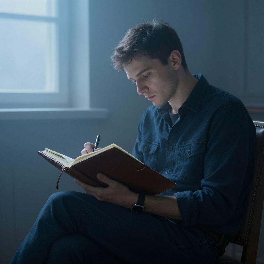 Photograph of a young Caucasian man with short, slightly messy brown hair, sitting in a dimly lit room with blue-tinted light from a window in the background. He is wearing a dark blue, button-up shirt and is focused on reading a brown leather-bound book, holding it open with his left hand and a pen in his right. He has a serious expression and is seated on a wooden chair. The light from the window casts a soft glow on his face, creating a tranquil ambiance. The room has simple, light-colored walls.