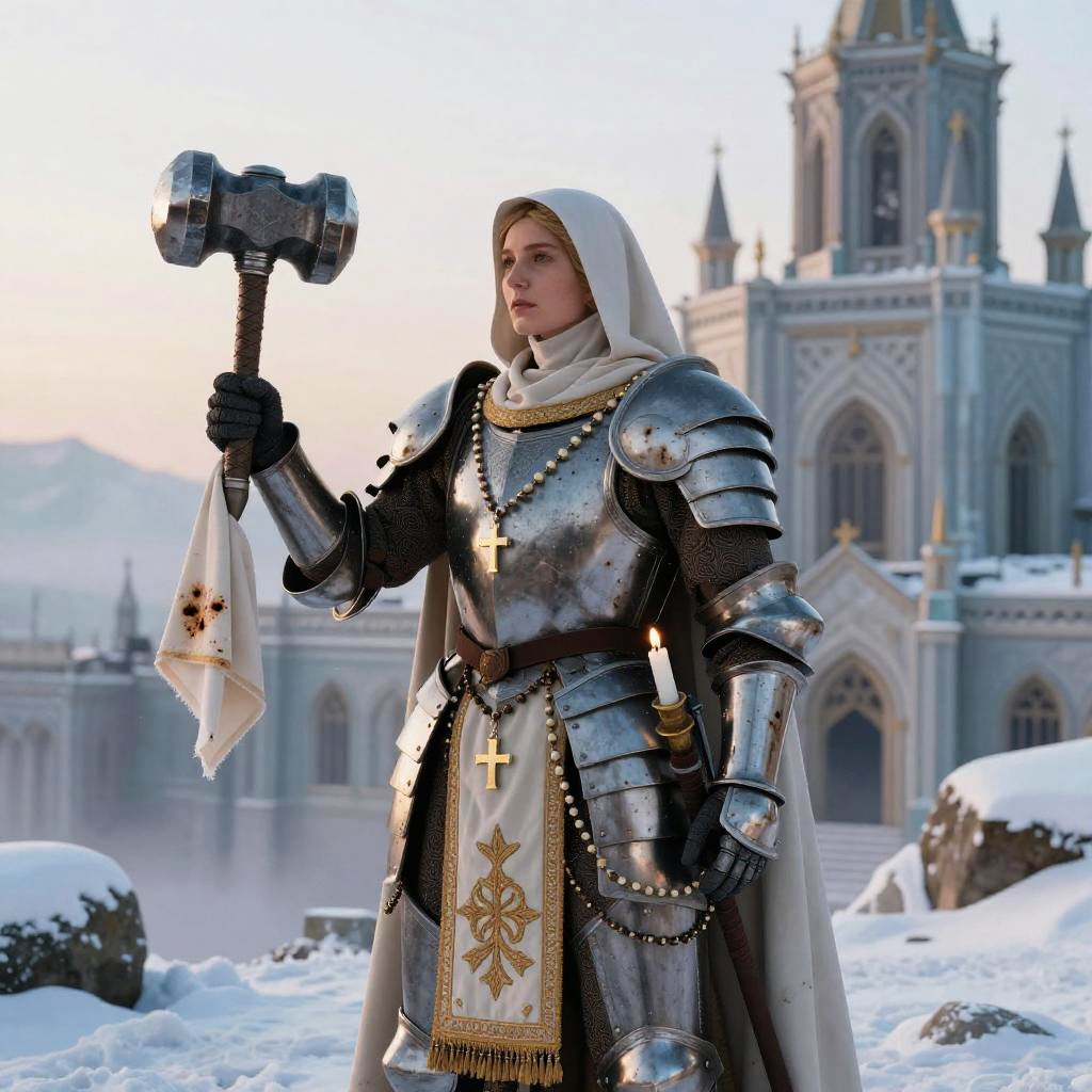 Heroic image of a Sister of Battle (Adepta Sororitas), wearing ceremonial ceramite armor with embroidered tabard, rosary chains and candle-scorches, holding relic thunderhammer wrapped in prayer cloths, amidst a snowbound monastery perched on an icy cliff at dawn.