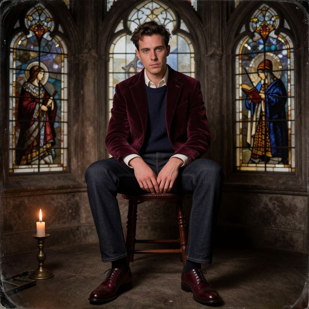 A man, burgundy velvet blazer, ivory dress shirt, navy knit sweater, dark denim jeans, burgundy brogues, Gothic arches, stained glass windows, flickering candlelight, collodion wet plate style, contemplative expression. Man has masculine face and piercing eyes