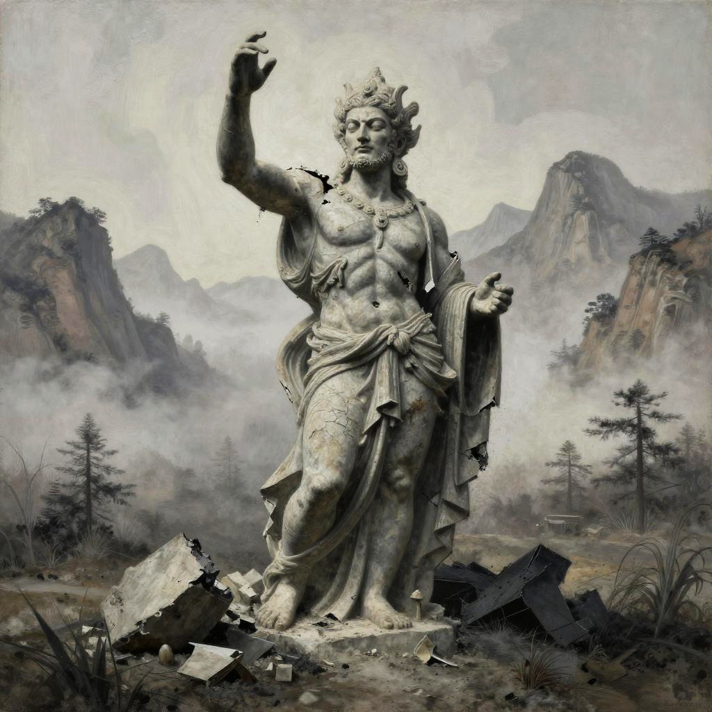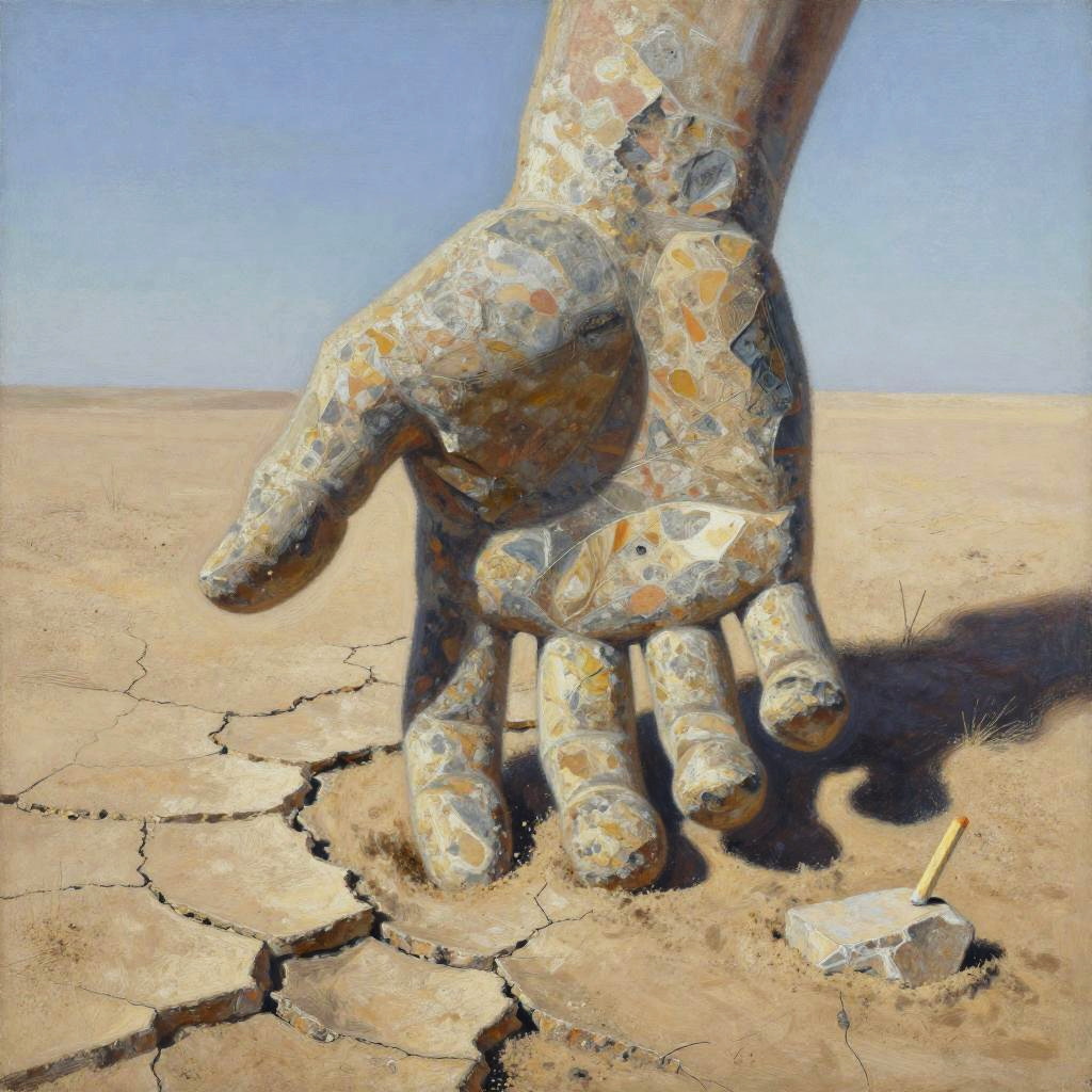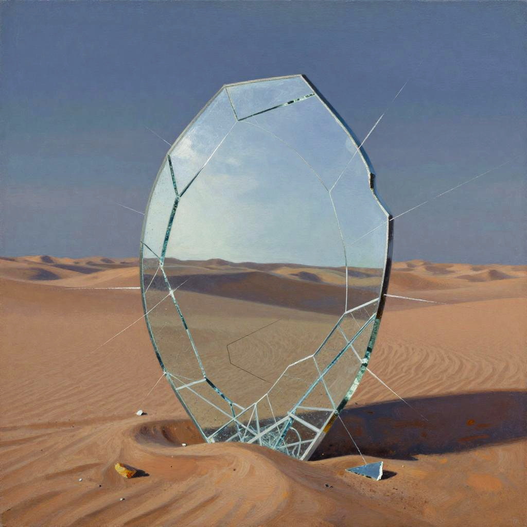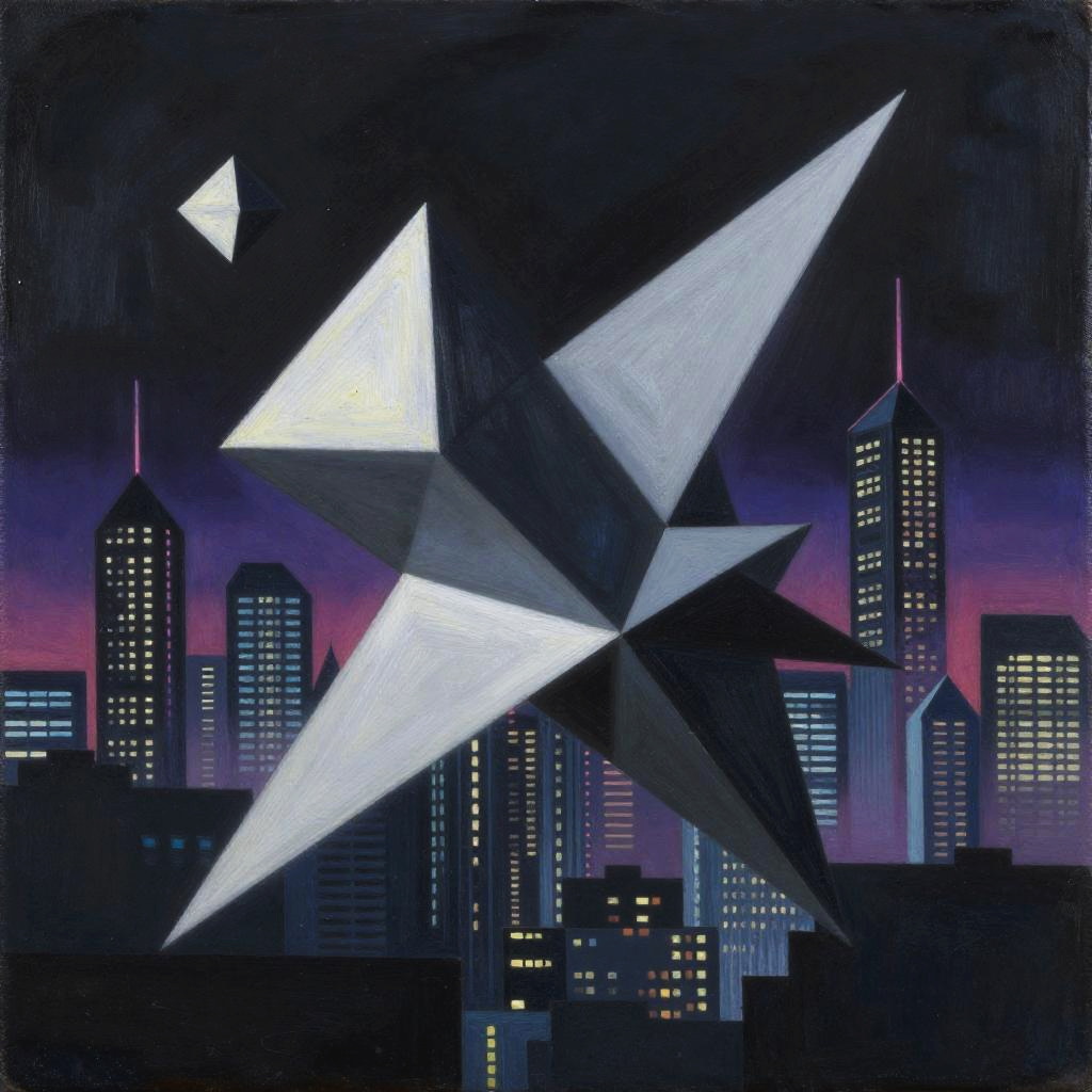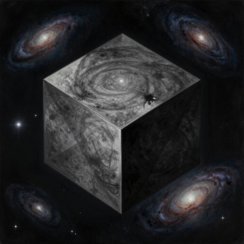 Surreal painting of a floating geometric cube against a dark space with swirling galaxies, in the style of Anselm Kiefer, using charcoal and metallic powders.