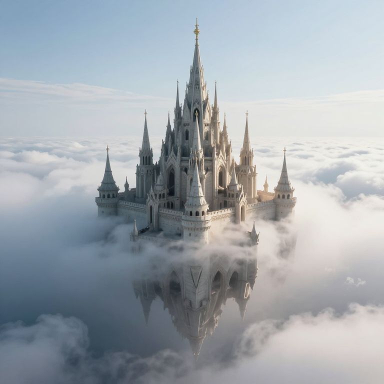 A majestic, spire-laden fortress emerges defiantly from a sea of swirling clouds, its ethereal presence defying gravity and reality as it floats serenely above the boundless horizon.