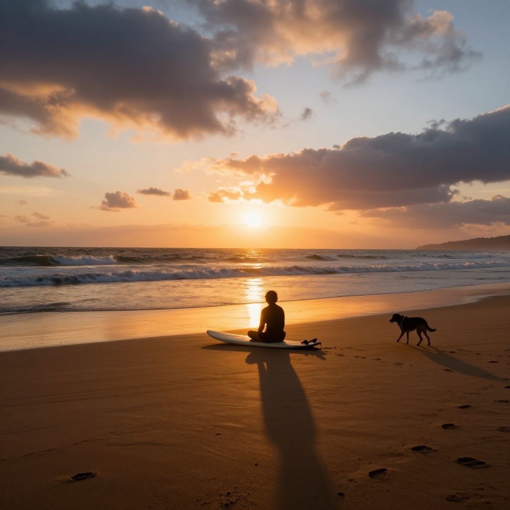 Photograph of a serene beach at sunset. A silhouetted surfer sits on a surfboard on the wet sand, facing the ocean. To the right, a black dog stands nearby. The golden sun, low on the horizon, casts a warm glow and long shadows across the scene. The sky is a mix of orange, pink, and purple hues with scattered clouds. Gentle waves roll in from the left, and the distant shoreline is faintly visible on the right. The surfboard and dog are in the foreground, while the ocean and sky dominate the background.