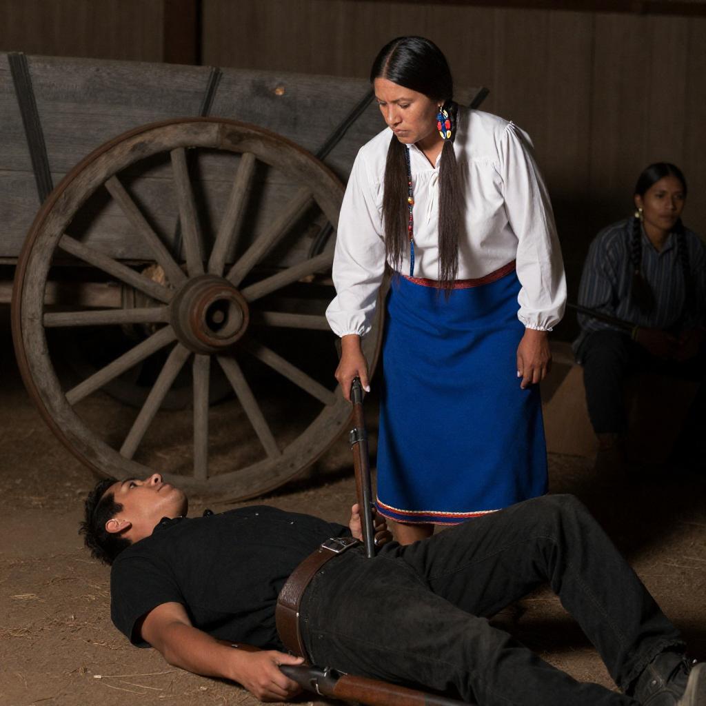 Photograph of a Native American woman with long, dark hair in a white blouse and blue skirt, standing over a lying man in black clothes, holding a rifle. An old wooden wagon wheel is in the background, with another person sitting to the right. The scene is dimly lit with a rustic, outdoor setting.